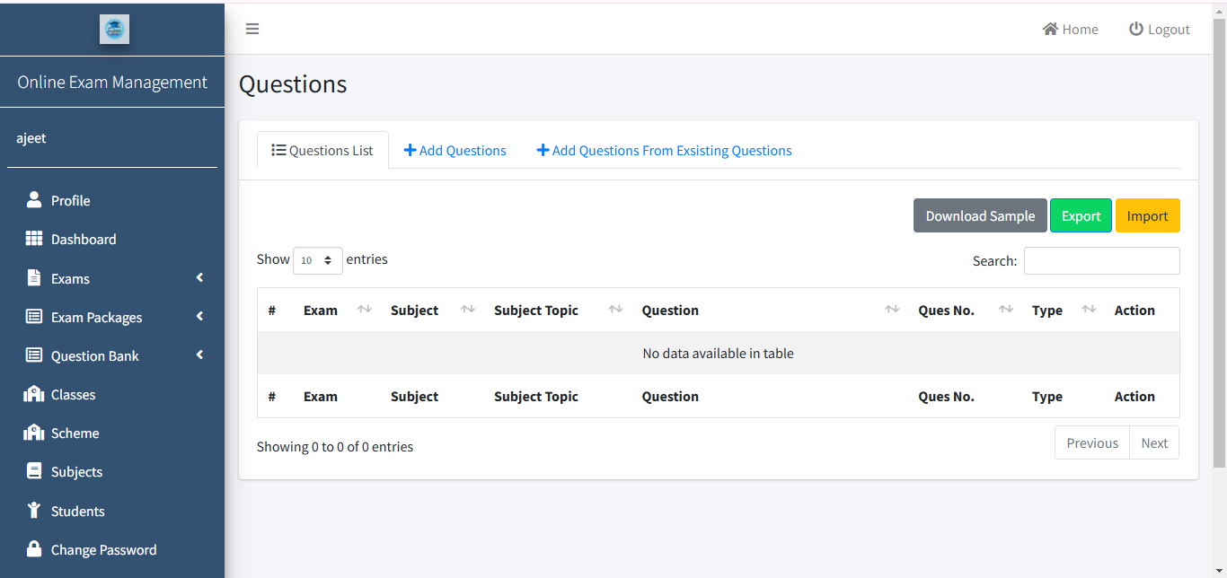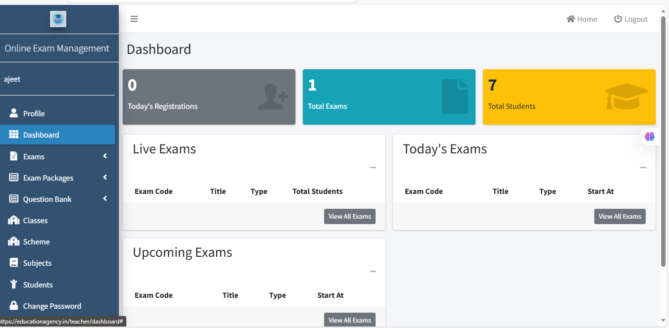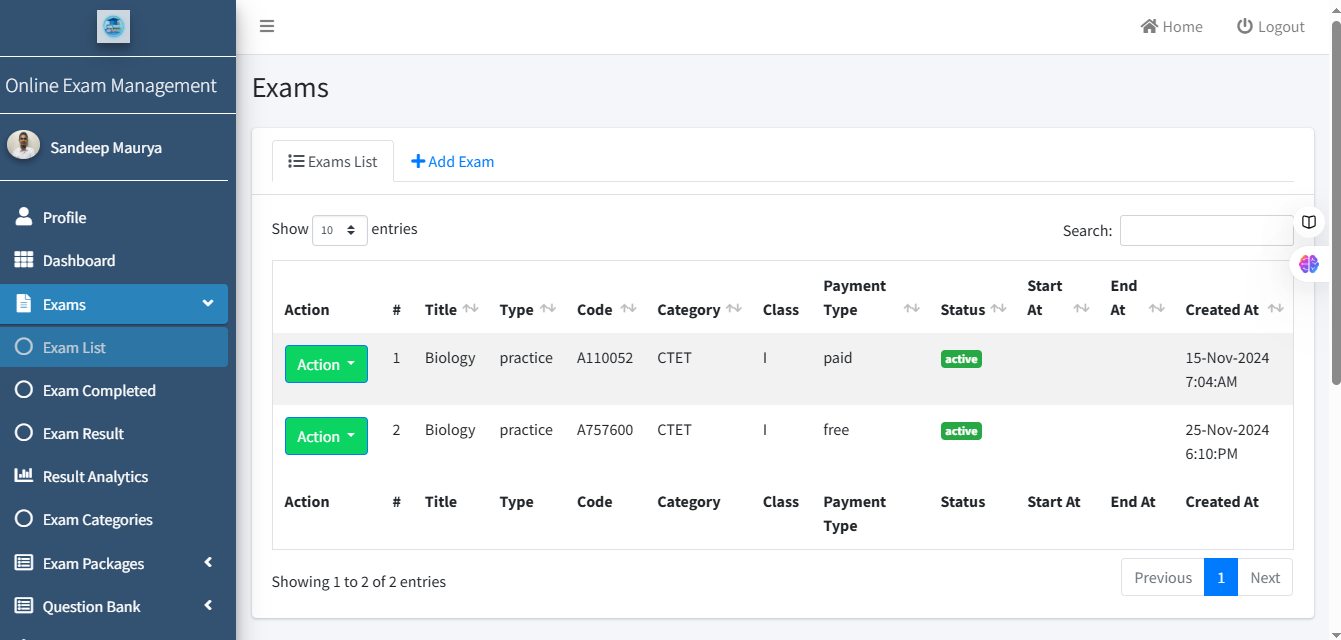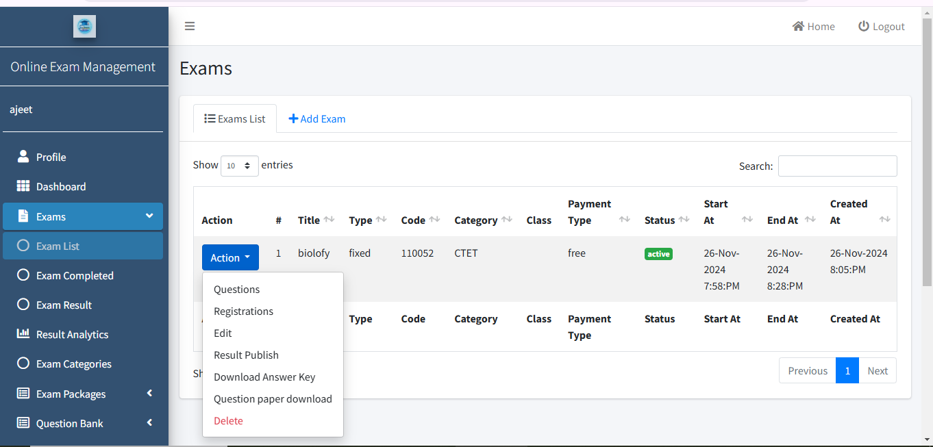 आप Exam Create होने के बाद आप Exam List वाले Section में Redirect हो जाएंगे ।